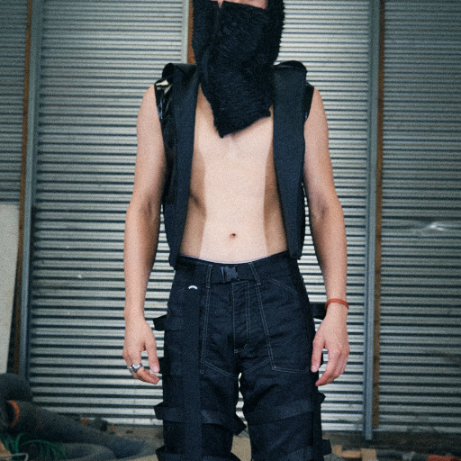 Fake leather and denim pants with harness skirt